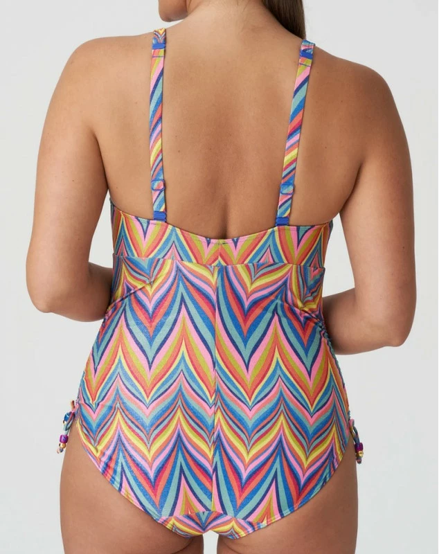 Maillot 1 pièce à rayures et bonnets plongeants, en tissu balnéaire affichant des paillettes subtilement incorporées. Les bretelles multipositions se portent droites, autour du cou ou croisées dans le dos. Rainbow Paradise est un imprimé multicolore estival aux accents pailletés.