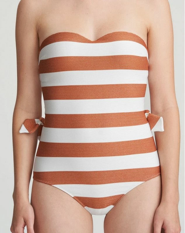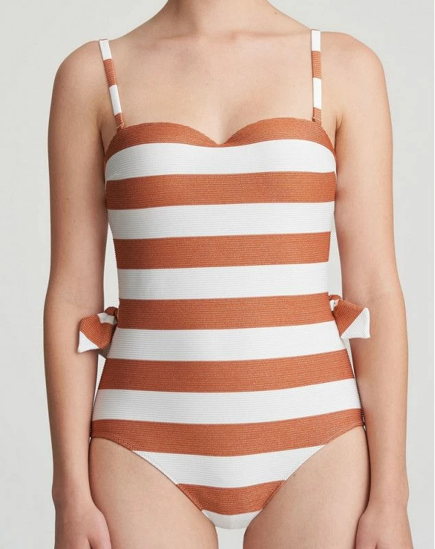 Le maillot de bain une pièce rembourré bretelles amovibles Fernanda de Marie Jo est un élégant maillot 1 pièce sans bretelles affichant un imprimé rayé blanc et un ton chaud cuivré. Idéal pour bronzer avec style ! Le décolleté droit du maillot de bain sublime le motif rayé et épuré. Les nœuds traversant les œillets sur les côtés accentuent votre taille. Il vous est disponible du bonnet A à D.