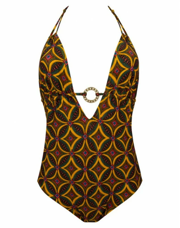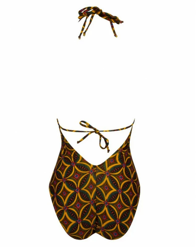 Le maillot de bain une pièce tour de cou de la collection La Muse Africa vous offre un style branché avec un anneau couleur or au centre de la poitrine. Pour une allure sexy chic, cette pièce propose un jeu de lacets qui dévoile la peau par transparence, un décolleté profond devant et derrière. Pour plus de confort, les mousses du maillot sont amovibles. Pour un meilleur maintien, une coulisse sous la poitrine permet de régler la couvrance des bonnets.