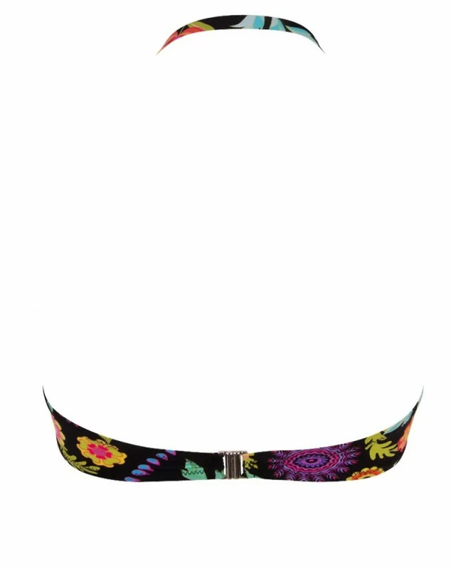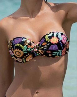 Soutien-gorge de bain bandeau à coque de la collection La Muse En Fleurs. Ce soutien-gorge propose des bretelles amovibles et réglables ainsi qu’un lacet en tour de cou. Une boucle prise dans le drapé habille le maillot de bain. Ce maillot de bain propose un nouage sur le devant pour régler la profondeur du décolleté.