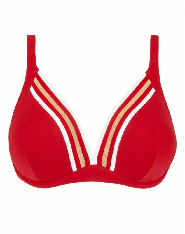 Le soutien-gorge triangle de bain à armatures Lise Charmel de la collection Energie Nautique offre un décolleté plongeant avec des bretelles réglables multipositions (droites ou croisées), ainsi qu’une maille unie tonique certifiée Lycra Sport et un élastique graphique aux touches cuivrées souligne le décolleté et le dos.
